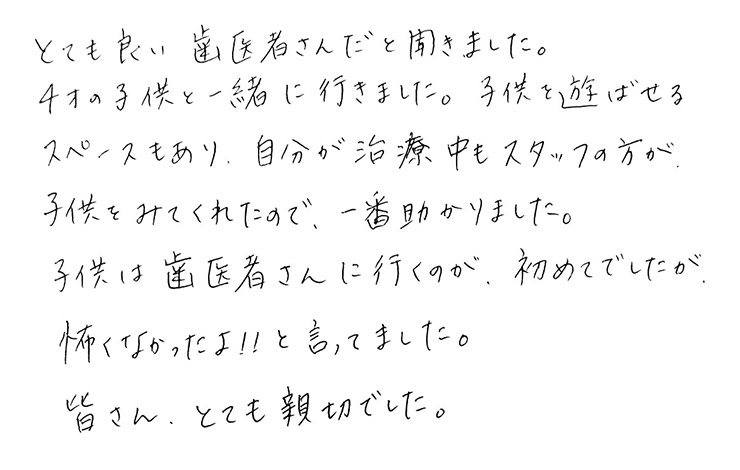 ・子供が歯を抜いたのですが、衛生士さんが緊張している子供の不安を取りのぞくように色々なお話をしてくれて子供も安心して治療を受けることができました。